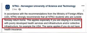 Текст на скриншоте: «NTNU — Норвежский институт науки и технологии. В соответствии с рекомендациями министерства иностранных дел, NTNU настоятельно рекомендует, чтобы все студенты NTNU вернулись домой. Это особенно относится к Вам, если Вы находитесь в стране с плохо развитыми службами здравоохранения и инфраструктуры и/или коллективной инфраструктуры, например, в США. То же применимо, если у Вас нет медицинской страховки». Печальная правда о «незаменимой нации» выходит так — не всегда медленно. Сначала помаленьку и струйками, но потом — неизбежное цунами.