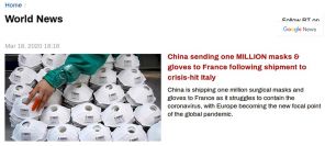 Текст на скриншоте: «Китай посылает один МИЛЛИОН масок и перчаток во Францию вслед за отправкой в пораженную кризисом Италию»… Эти китайские комми не только побили вирус в рекордно короткие сроки, они еще и помогают умирающим капиталистам (которые, кстати, не помогают друг другу!)