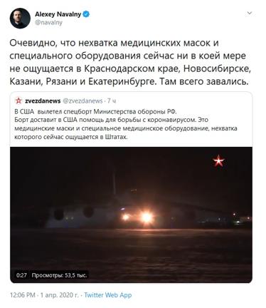 Помощь России оценил лично Дональд Трамп, поблагодаривший ее в ходе брифинга в Белом доме. Несмотря на хваленую американскую медицину, она сейчас, объективно, не справляется, поэтому поддержка Москвы - это как раз кстати. В США ожидают до 200 тыс. смертей от коронавируса, и об этом заявили не какие-то мамкины паникеры, а Трамп. Мэр Нью-Йорка признался, что медицинских запасов у города осталось ровно на неделю, а аппараты ИВЛ в серьезном дефиците.
