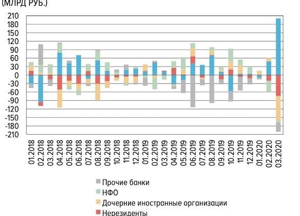Выход иностранных инвесторов из российских активов начался в последней декаде февраля и ускорился в марте, отражая «реакцию на распространение пандемии коронавирусной инфекции и отсутствие уверенности в заключении нового соглашения по ограничению добычи на рынке нефти», констатирует регулятор.