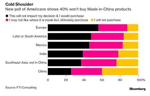 Около 40% американцев намерены товары китайского производства, показал опрос 1012 взрослых граждан, проведенный в Вашингтоне 12-14 мая консалтинговой компанией FTI Consulting.