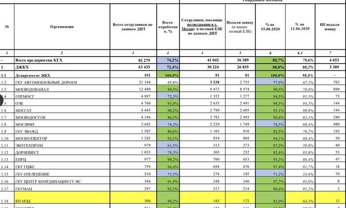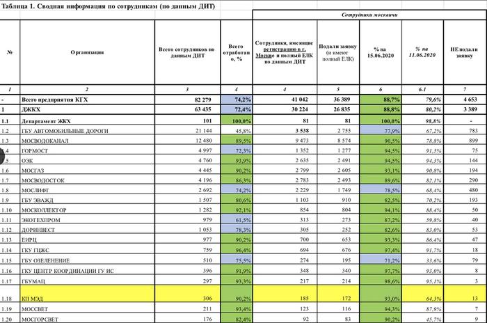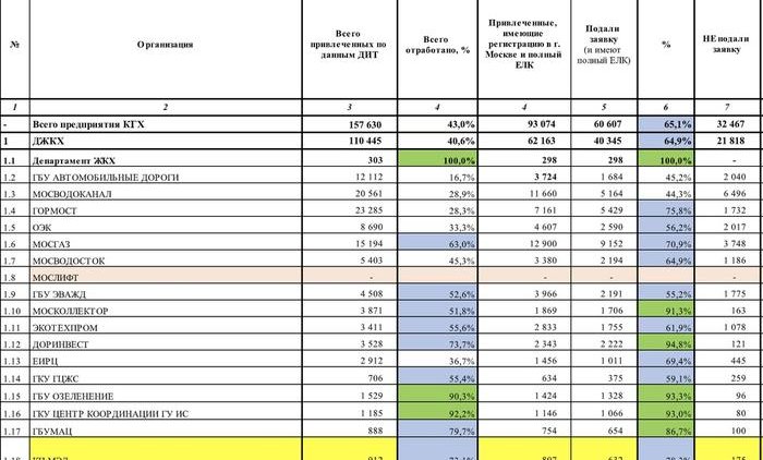 Очень хорошо видно, что из 12 тысяч 480 сотрудников Мосводоканала 89% уже прошли электронную регистрацию, а вот в ГБУ «Озеленение» ещё осталось 79 отщепенцев, которые не спешат на голосование по обнулению.
