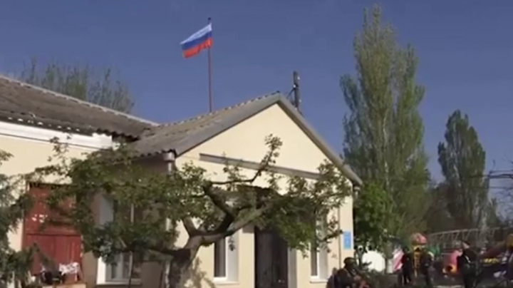 На опубликованной видеозаписи показано, как российские военнослужащие вскрывают двери в помещениях поселковой рады, снимают украинские таблички со здания и помогают поднять российский флаг.