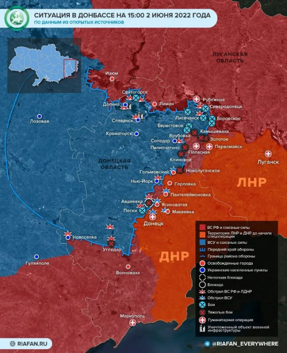 Армии России и республик Донбасса продолжают окружать крупный укрепрайон вооруженных сил Украины в фактически не контролируемых Донецкой и Луганской народными республиками до 2022 года территориях соответствующих областей. Бои 3 июня идут в районе Авдеевки, Святогорска, русские силы продвигаются от Северодонецка к Лисичанску (ЛНР).