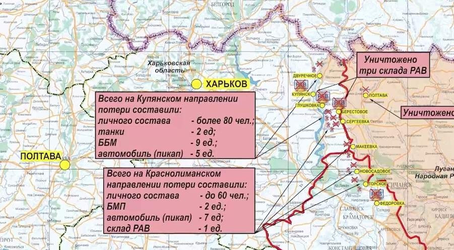 В районе населенного пункта Двуречное Харьковской области сорвана переправа ротной тактической группы ВСУ через реку Оскол. В результате удара армейской авиации и артиллерии уничтожено более 30 украинских военнослужащих, четыре бронеавтомобиля и два пикапа.