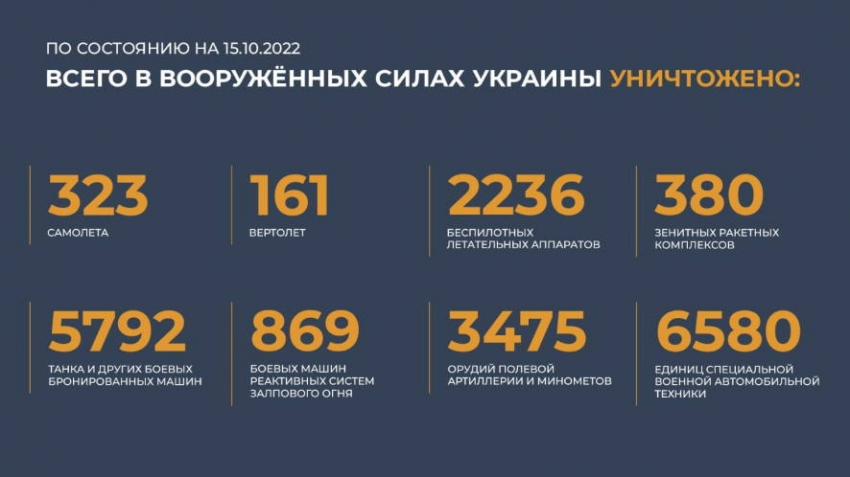 Всего с начала проведения специальной военной операции уничтожены: 323 самолета, 161 вертолет, 2236 беспилотных летательных аппаратов, 380 зенитных ракетных комплексов, 5792 танка и других боевых бронированных машин, 869 боевых машин реактивной системы залпового огня, 3475 орудий полевой артиллерии и минометов, а также 6580 единиц специальной военной автомобильной техники.