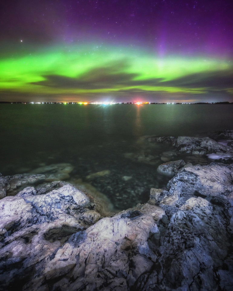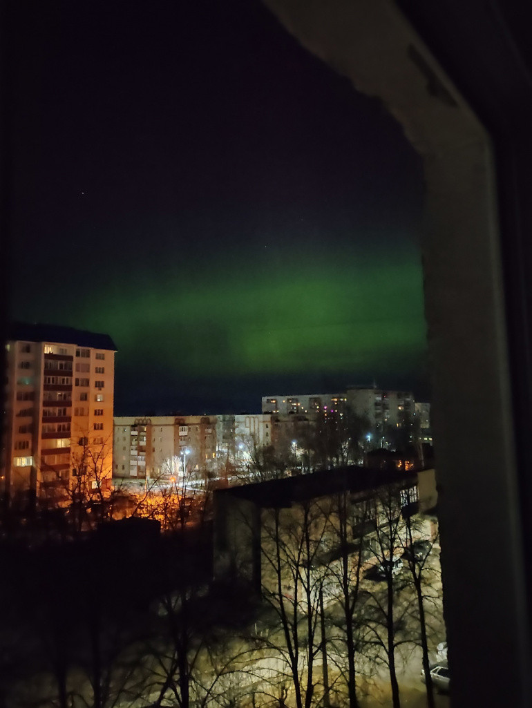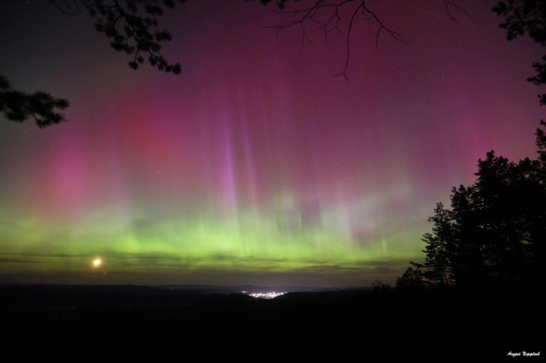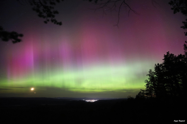 — Сперва ничего не предвещало, что будет северное сияние, мы отправились снимать сближение Луны и Венеры на гору Моховую. Оттуда увидели, что над городом есть какое-то свечение, — рассказали авторы фото. — Направив туда камеру, стало точно ясно, что это северное сияние. Небо переливалось разными цветами, столбы света то вспыхивали, то пропадали или ползли по горизонту. Был полнейший восторг…