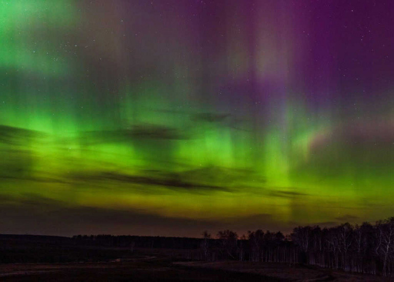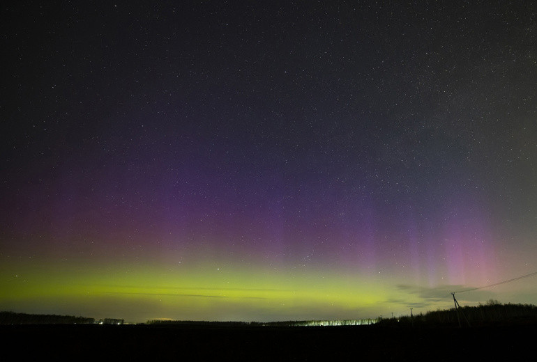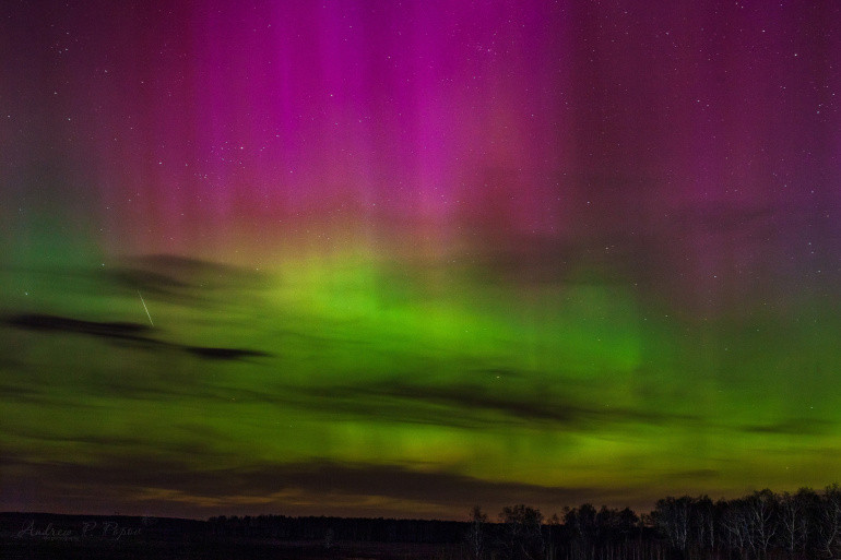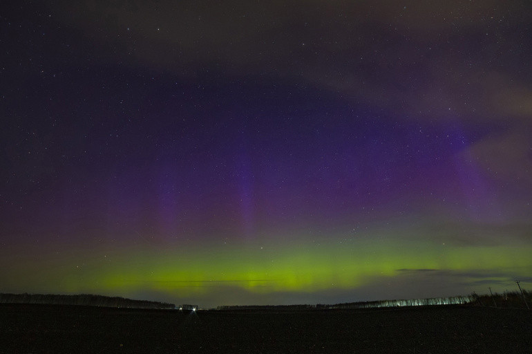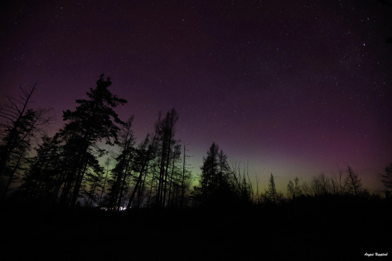 — Мне повезло. Я просто любовался молодой Луной и Венерой рядом с ней. Совсем близко. Остановился в поле и любовался, смотрел как закатится за горизонт. Ровно полночь. Решил, что где-то там за горизонтом или за лесом работают большие прожектора. И свет от них так странно отражается от облаков, или что-то подобное. Бывает такое, — написал Андрей Попов. Однако свечение появилось в другой части неба, ярче, полосами, и вот тут-то до меня дошло — северное сияние!