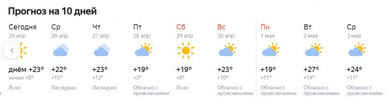 Ночи тоже окажутся тёплыми, без минусовых температур, — синоптики обещают от +4 до +13 градусов. Днём во вторник, 25 апреля, и вплоть до четверга будет от +18 до +24. Порывы тёплого юго-западного ветра будут достигать 16 метров в секунду.