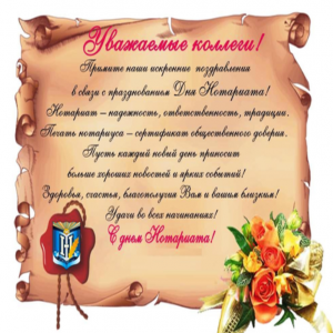 Сегодня праздник у великих людей. Ведь без нотариуса не обходится никакой человек, который имеет дело с документами. Очень хорошо, что сейчас можно зайти в кабинет, отдать бумаги и ни о чем не беспокоится, ведь профессионал сделает все в лучшем виде. Пусть с вами никогда не случится беда, а жизнь и работа принесет лишь удовольствие и радость.