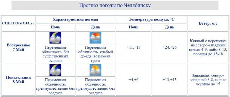 В Челябинске 7 мая прогнозируются переменная облачность и слабый дождь с грозой. Температура воздуха днём составит от 24 до 26 градусов тепла. Дополнит погодную картину южный ветер, переходящий на северо-западный, с порывами до 18 м/с.