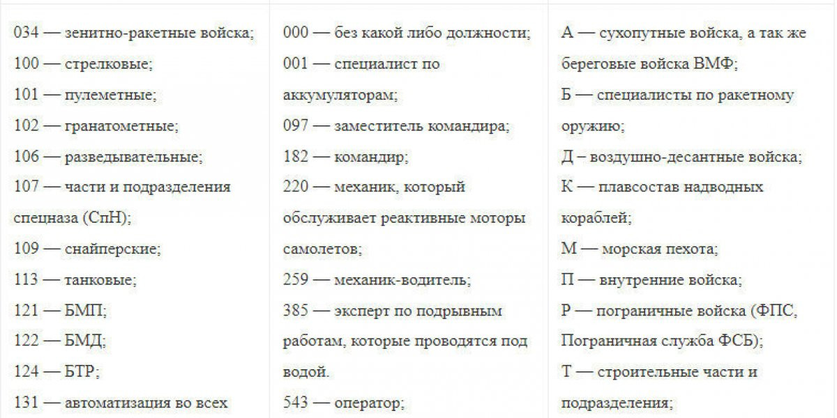 Соответствующий перечень ВУС опубликован в Сети. К примеру, ряд военкоматов заинтересован в следующих специальностях: 100, 106, 131, 166, 878, 879, 113, 554.