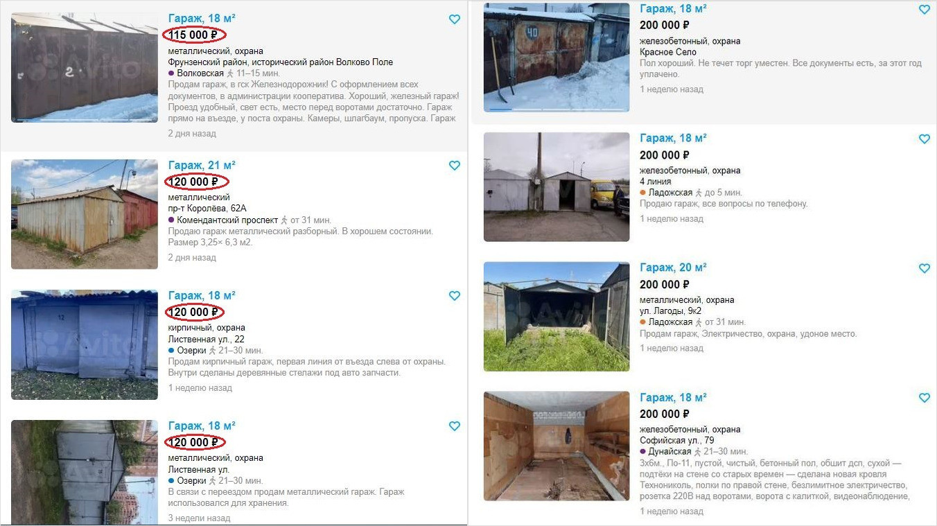 Средняя стоимость гаражей варьируется от 100-120 тысяч рублей до 200 тысяч и более. Отдельно стоит учитывать, что петербуржцы продают и дорогостоящие гаражи, многие из которых расположены на территориях уязвимых кооперативов. Любой из них, теоретически, может оказаться в поле зрения чиновников. Цена таких участков доходит до одного миллиона рублей.