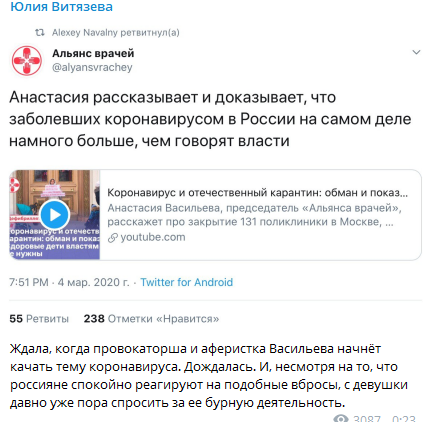 Так, председатель профсоюза «Альянса врачей» (создан Навальным для отмывания денег) Анастасия Васильева стала распространять информацию о многочисленных заражениях опасным короновирусом среди граждан России.