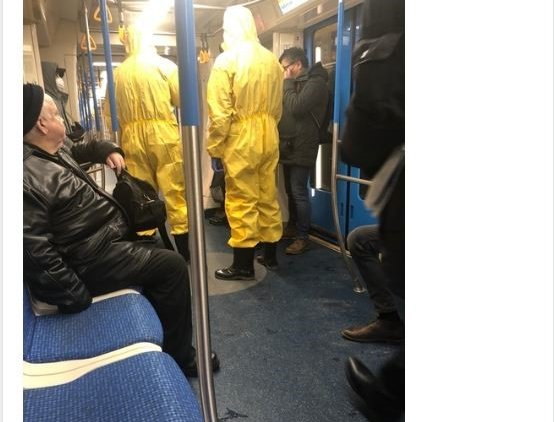 В первом два человека в специальных защитных костюмах проверяли пассажиров метрополитена специальным оборудованием. Им подыгрывали люди азиатской внешности, наигранно кашляя. Некоторых ребята в спецодежде выводили под руки.