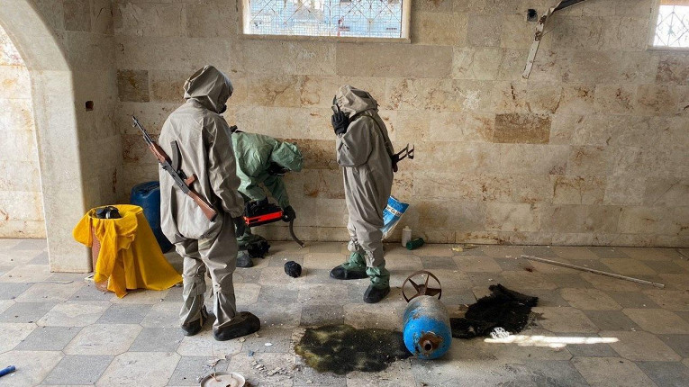 В одном из домов жилого района Серакиба солдаты сирийской армии обнаружили баллон с вытекшей жидкостью и средства химической защиты. Как сообщил офицер армии САР, в ходе досмотра было выявлено взрывное устройство, а жидкость по предварительной информации – хлор.