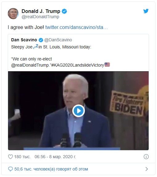 Трамп же поспешил ретвитнуть запись и ответил: «Я согласен с Джо».