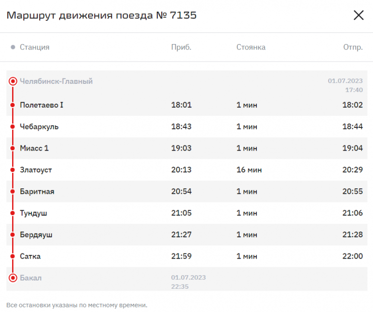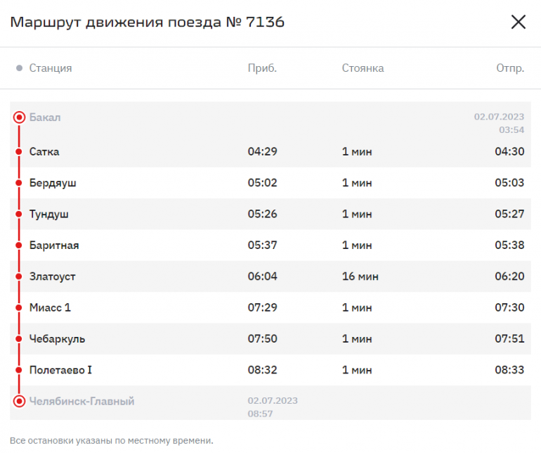 Из Бакала электропоезд будет отправляться ежедневно в 03:54 и прибывать в Челябинск в 08:57. Время в пути составит 5 часов и 3 минуты.