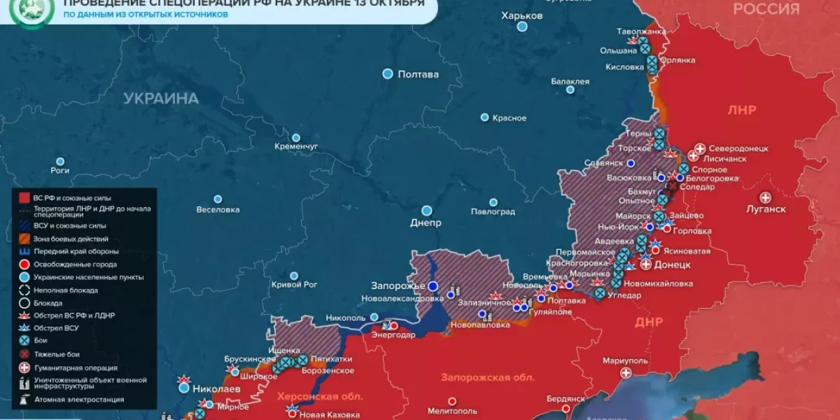 Как развивается обстановка на Украине сегодня, 14 октября 2022 года? Как выглядит последняя карта боевых действий? Что известно об обстрелах ВСУ территории РФ? Об этом далее.
