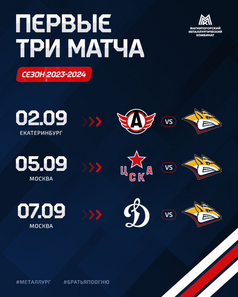 «Магнитка» также стартует в гостях. 2 сентября «сталевары» сыграют в Екатеринбурге с «Автомобилистом», 5 сентября поборются в Москве с ЦСКА, а 7 сентября выйдут на столичный лёд против «Динамо».