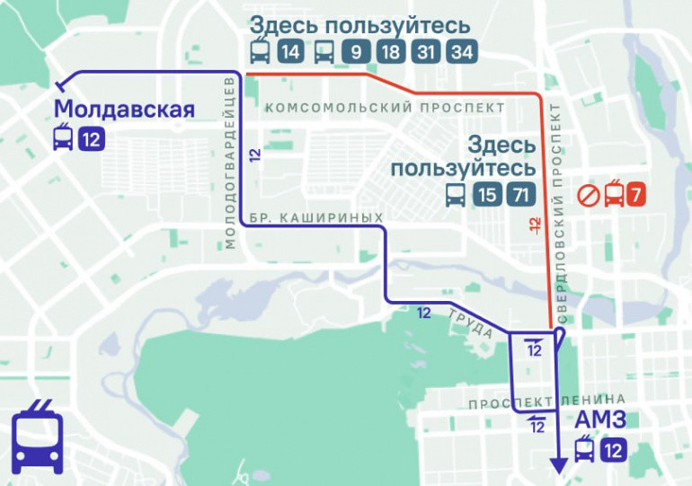 Троллейбус № 12 будет следовать по такому маршруту: Молдавская — Молодогвардейцев — Братьев Кашириных — Северо-Крымская — Труда — Свердловский проспект — АМЗ. В обратном направлении: АМЗ — Свердловский проспект — проспект Ленина — Энгельса — Труда — Северо-Крымская — Братьев Кашириных — Молодогвардейцев — Молдавская.