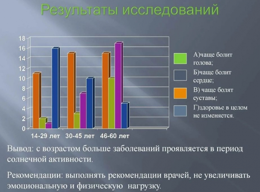 Известно, что возмущения на Солнце у некоторых людей провоцируют головные боли, ощущение усталости без причины и сонливость. Российские ученые пришли к выводу, что магнитные бури могут влиять на свертываемость крови, а их коллеги из Университета Манчестера выяснили, что магнитные бури, низкое давление, влажность и ветер усиливают хроническую боль.