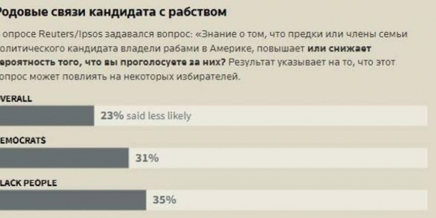 То есть, опрос показал, что не менее, чем для 35% процентов темнокожего населения США вопрос о предках-рабовладельцах может повлиять на результат голосования.