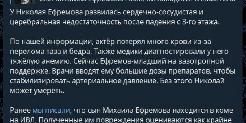 По данным Телеграм канала Mash, после падения с третьего этажа, у актера Николая Ефремова обнаружились признаки сердечно-сосудистой и цереброваскулярной недостаточности.