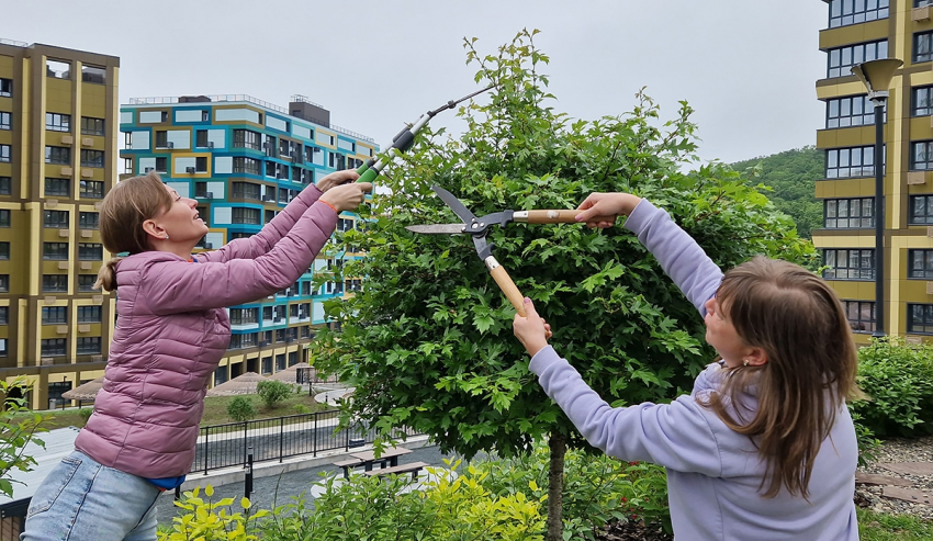 Сразу после этого эксперт по уходу за хвойными во Владивостоке Юрий Щербак поделился с местными жителями важными знаниями в области озеленения жилых комплексов и ухода за растениями. Такой практический семинар вызвал особый интерес среди взрослой части жителей, особенно, когда они вооружились секторами и вместе с экспертом, а также с автором “Сочинской аллеи” Ларисой Липатовой начали учиться стрижке растений.
