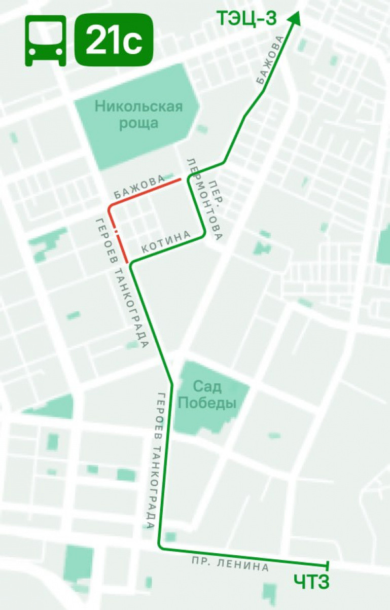 Автобус № 21с будет курсировать по такому маршруту: ЧТЗ — Героев Танкограда — Котина — переулок Лермонтова — Бажова — ТЭЦ-3.