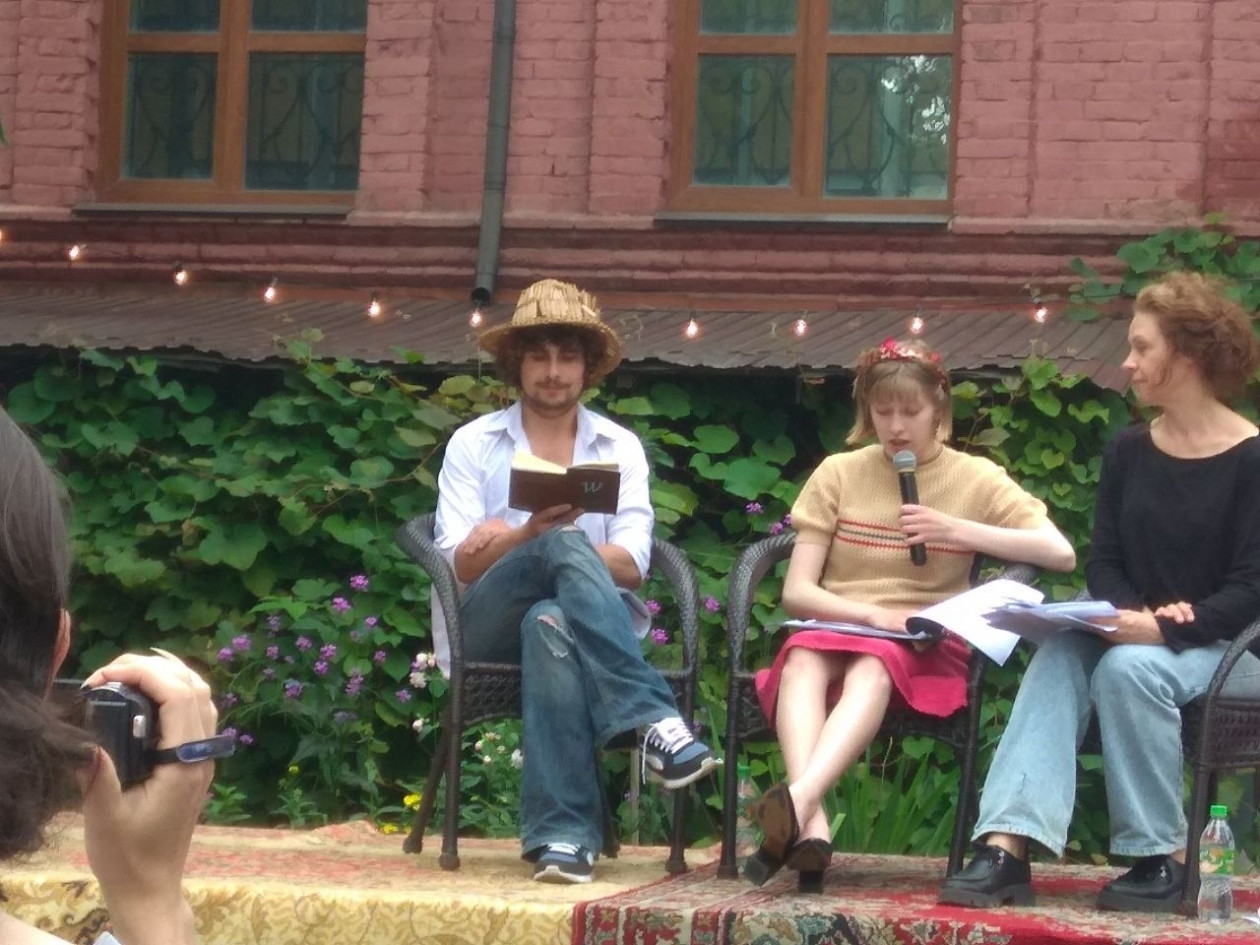 Не обошлось и без чтения вслух. Были прочитаны выдержки из “Школьных сочинений Фритца Кохера” — первой книги швейцарского поэта и прозаика Роберта Вальзера, написанной от лица подростка. Тексты на совершенно разные и непростые темы были озвучены двумя приамурскими поэтами — Давидом Загировым и Леной Левшой, а также дальневосточным режиссёром современного театра Анастасией Федосеевой.