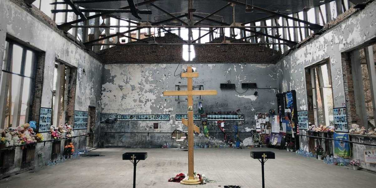 Пожалуй, в русском языке не найдется слов, чтобы описать чувства, которые испытываешь при входе в этот спортзал. Нечто похожее человек ощущает, впервые оказавшись в церкви в юном возрасте. В центре — массивный крест, вдоль стен — свечи и вручную сооруженные мемориалы. Но вместо еле уловимого религиозного таинства – давящая атмосфера и ужас, отражающийся в застекленных портретах погибших детей.