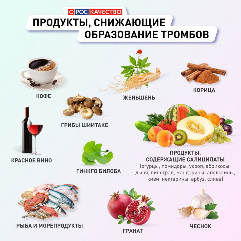 Эксперты Роскачества подготовили инфографику, где представили продукты, снижающие риск тромбоза.