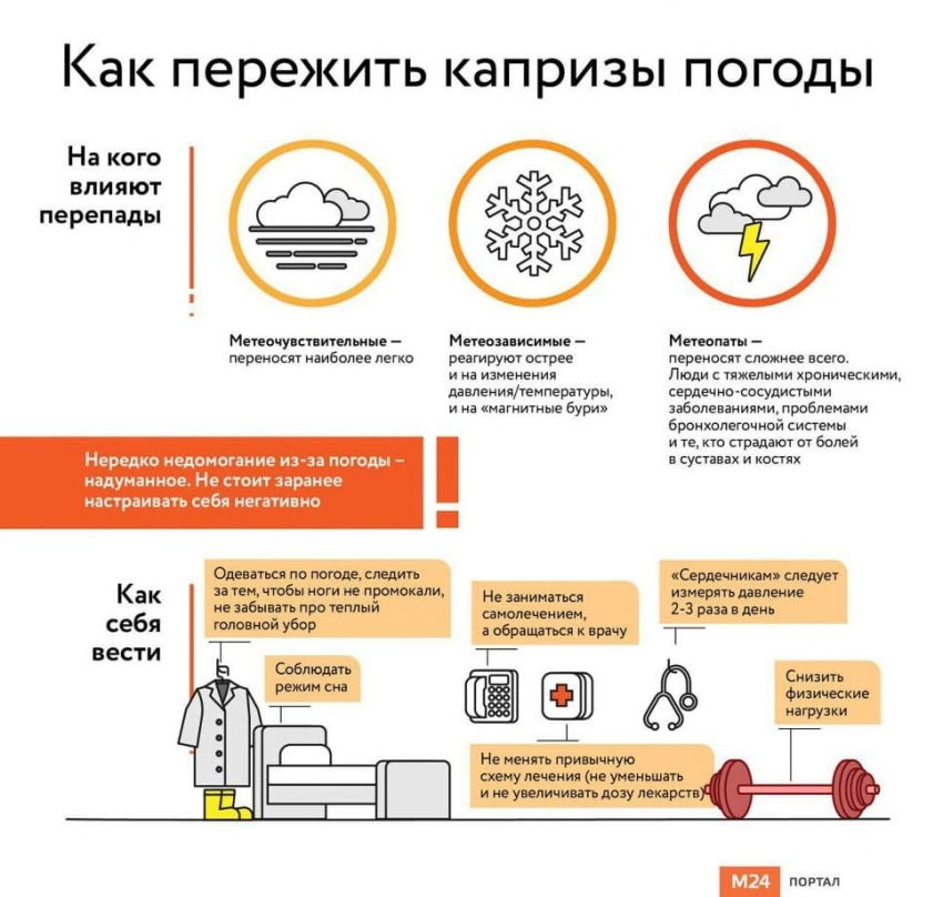 По словам Марины Константиновой, метеозависимость не является болезнью, однако некоторые меры защиты все же следует предпринять. Например, нужно уменьшить физическую нагрузку. В первую очередь данная рекомендация касается людей старшего возраста, беременных женщин и пациентов с хроническими заболеваниями, сообщают "Известия".