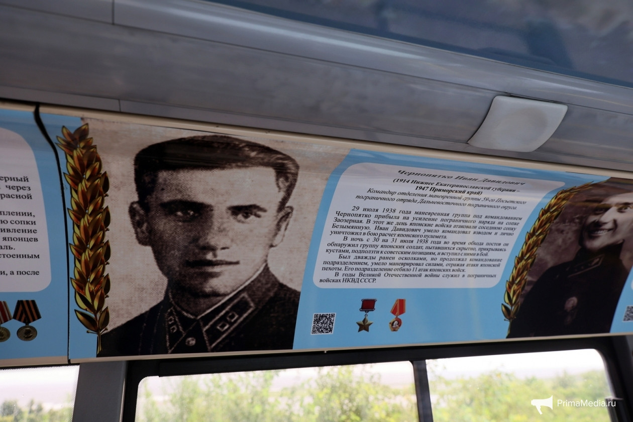 “Это своего рода музей на колёсах, где все жители и гости нашего края могут узнать частичку истории Приморья, а именно — событий около озера Хасан, которые произошли 85 лет назад. Тогда японская армия пыталась захватить часть нашего края, а войска красной армии защитили родину. Благодаря этому автобусу мы можем узнать их имена, а также подробности тех героических событий”, — рассказал заместитель министра культуры и архивного дела Приморского края Алексей Чеблуков.
