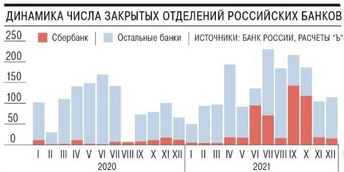 В 2022 году российские банки продолжили сокращать свои офисы. Всего с января по начало июня Сбербанк закрыл 159 отделений, остальные банки — 511 отделений (Подробнее ➤).