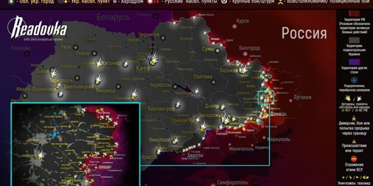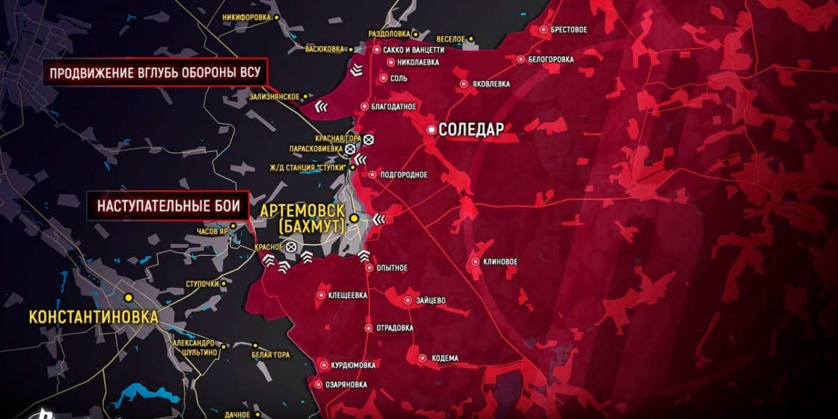 Основная задача русской армии в Артемовске (украинское название — Бахмут) — дать возможность войскам продвинуться. Об этом в интервью военкому Семену Пегову заявил бизнесмен Евгений Пригожин. Он назвал город «главной достопримечательностью» украинских военных. Карта