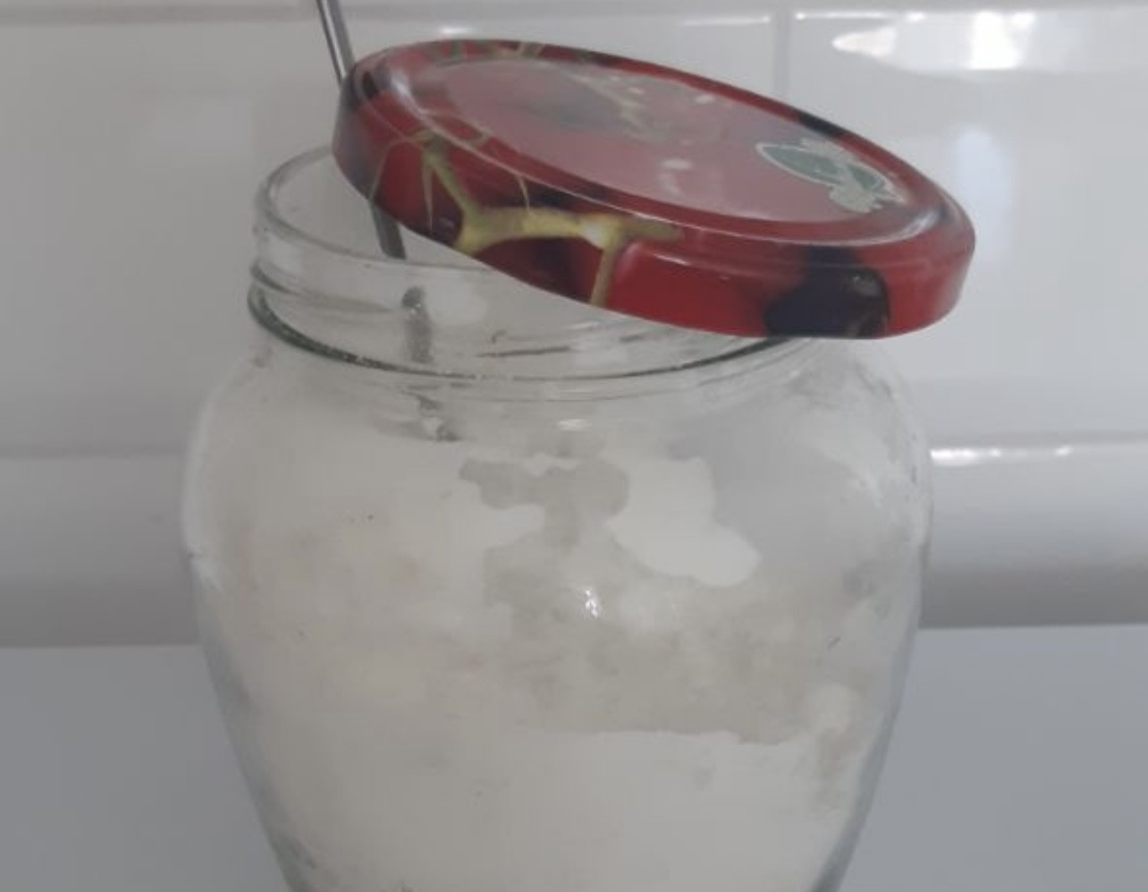 - Смешайте 3 столовые ложки соды с 50 граммами натертого хозяйственного мыла.