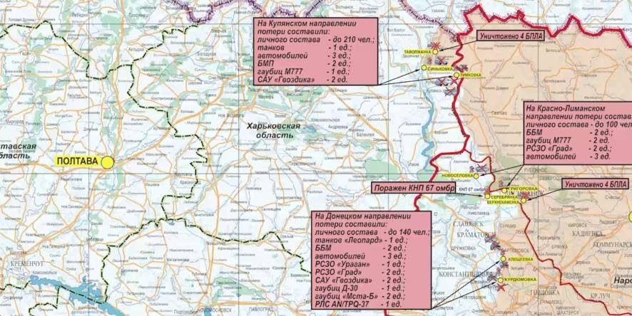 Внушительные потери украинской армии за сутки отмечены на Донецком направлении. Подразделения "Южной" группировки войск поразили целый ряд военных объектов, что привело к гибели порядка 235 украинских военнослужащих. Также были уничтожены две боевые бронированные машины и шесть автомобилей. Активные боевые действия были зафиксированы в районах следующих населенных пунктов: Красное, Васюковка, Раздоловка и Клещеевка Донецкой Народной Республики.