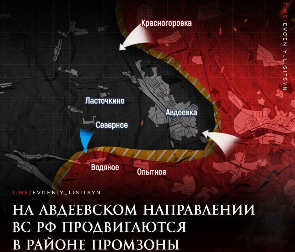 Отмечается, что бои за Авдеевский коксохимический завод продолжаются. Украина предприняла попытку нанести удар по российским позициям у Степного. На территории завода происходят встречные бои. В то же время, ВС РФ имеют успехи в промышленной зоне. Ситуация в Марьинке остается неизменной.