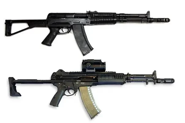 Ну а история нашего героя начинается уже в 2010-х с ОКР «Ратник». Причём по первоначальным требованиям должны были быть разработаны два автомата под патроны 5,45×39 мм и 7,62×39 мм. Так в Коврове появились А-545 и А-762. Более чем понятно, какой образец под какой патрон был создан. Ковровские инженеры переработали свою, уже на тот момент тридцатилетнюю, конструкцию. Принцип компенсации отдачи не изменился, но вот внешне автомат, согласно требованиям ОКР, изменился очень сильно. Если поместить рядом АЕК-97 и А-545, то сперва можно и не понять, что это, по сути, одно оружие. Прицельные приспособления, цевьё, крышка ствольной коробки, планки Пикатинни и, наверное, самое большое визуальное отличие – складывающийся телескопический приклад, у нас скорее ассоциирующийся с продукцией Heckler & Koch GmbH.