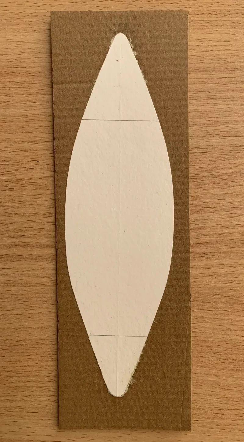 После того как палуба, наклеенная на упаковочный картон, была вырезана, на нее был наклеен профиль корпуса, также на картонном основании. Получился Т-образный профиль корпуса, к которому, а именно к палубе, была приклеена картонная «ручка» из нескольких склеенных между собой кусочков картона и такое же картонное основание. Все пространство между палубой и профилем корпуса было заполнено пластилином так, чтобы получился ровный седловатый корпус египетской ладьи.