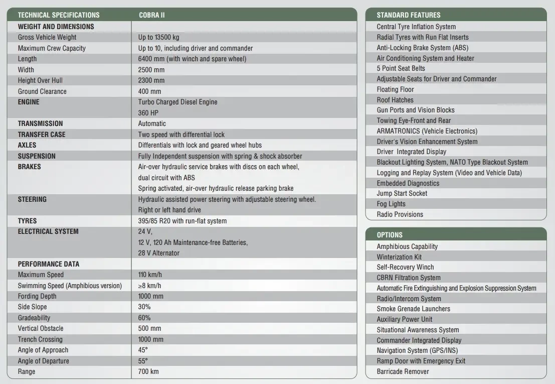 Лёгкая тактическая бронемашина Cobra II 4x4 [массой до 13,5 т] представляет собой модульную платформу, обладающую превосходными ТТХ – выдающейся мобильностью, более высокой баллистической и противоминной защитой, увеличенной грузоподъёмностью и внутренним объёмом
