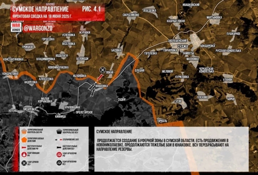 На Сумском направлении продолжаются попытки ВСУ атаковать позиции российских войск в районе границы. Отражены очередные накаты в направлении Тёткино и Нового Пути. Причем, по сообщениям группировки «Север», в атаке на новый путь использовались испаноговорящие наёмники. Продолжается создание буферной зоны в Сумской области. Есть продвижения в Новониколаевке. Продолжаются тяжелые бои в Юнаковке. ВСУ перебрасывают на направление резервы.