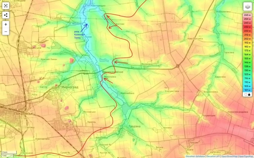 По данным Подоляки, ВС РФ продвинулись широким фронтом к реке Казённый Торец в районе Новоторецкого и Владимировки, обходя терриконы и ключевые высоты, за которые ВСУ могли бы закрепиться.