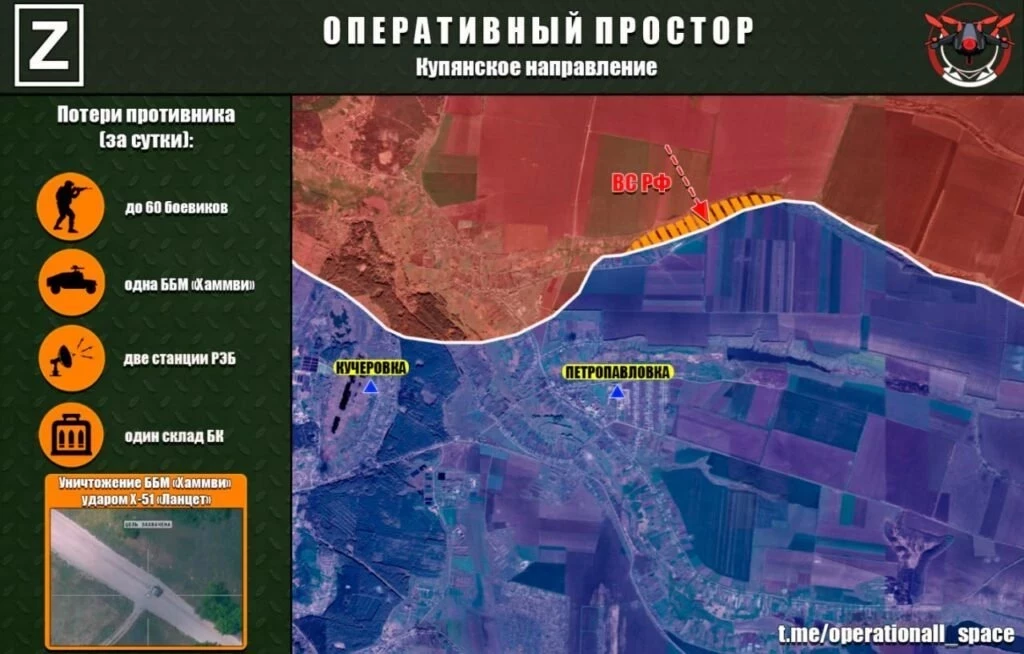 На Сумском направлении в район Юнаковка-Хотень противник перекинул резервы, безуспешно пытаясь остановить российское продвижение. В районе Корчаковского Яра, у Андреевки, наши отбили 10 контратак ВСУ. В районе Новониколаевка-Варачино - бои высокой интенсивности. В районе Яблоновки наши подразделения зачистили посадки и вышли к дороге на Храповщину.