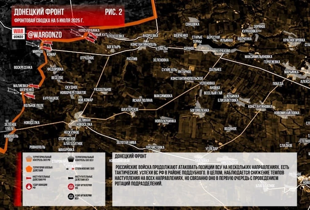 Вооружённые силы Российской Федерации (ВС РФ) продолжают мощное наступление сразу на нескольких важных участках в зоне военной спецоперации. Наш сайт N4k предлагает ознакомиться с последними новостями из зоны СВО, а также публикует свежую карту боевых действий, актуальную на субботу, 05.07.2025.