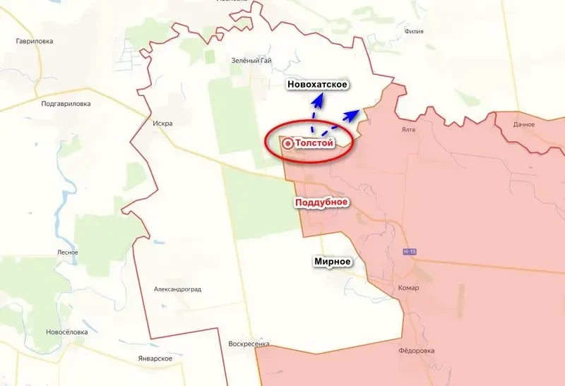 Села Толстой и Поддубное расположены рядом друг с другом. Взятие Поддубного позволило нашим войскам устроить огневой мешок для подразделений ВСУ в селе Мирное. Вероятней всего, основной акцент будет сделан на освобождении Мирного, также наступление будет вестись в северном направлении, т. е. в сторону Новохатское и Грушевское.