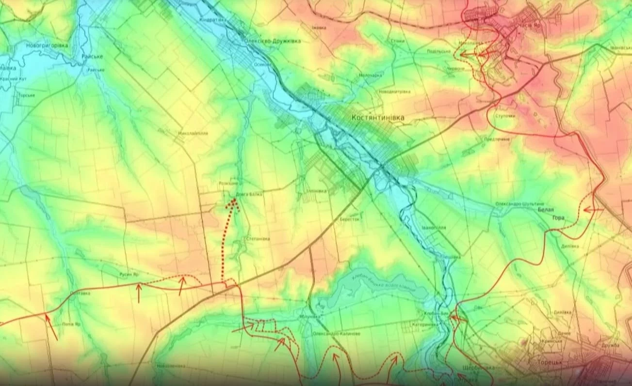 "Также мы развернули наступление, которое уже можно отобразить на картах в районе Русино-Яра. Здесь восточнее Русино-Яра мы тоже заняли несколько важных лесопосадок. И очевидно, что мы пытаемся развивать дальше наступление на Степановку и далее Долгую Балку, чтобы таким образом обрезать коммуникации противника на Константиновку с запада и соответственно взять всю эту группировку в клещи. Судя по тому, что я вижу, мы вероятнее всего здесь тоже не будем в лоб штурмовать Константиновку, а попытаемся охватить её и заставить противника её покинуть", - отметил Юрий Подоляка.