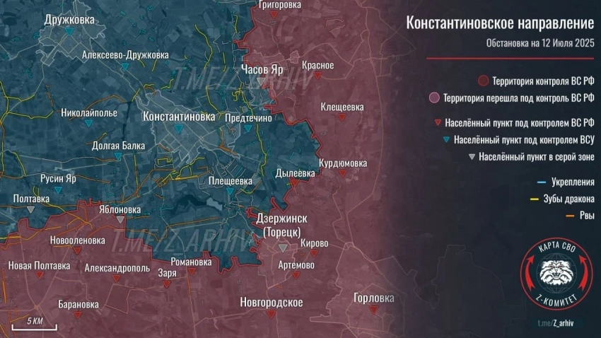 На Константиновском направлении наши продвигаются в районе Попов Яра. ВСУ контратаковали в Александро-Калиново. В Часов Яре освобождён ряд домов на юге. В районе Григоровки враг выбит с укреплений у канала, открывается путь к Марково и Новомарково.